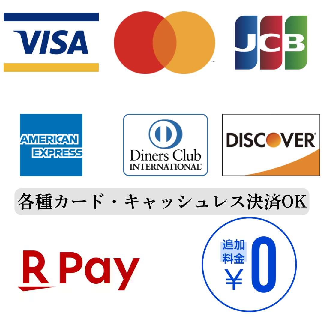 VISA・JCB・アメリカン・エキスプレスなど、主要ブランドのカードの他楽天ペイなどご利用いただけます。